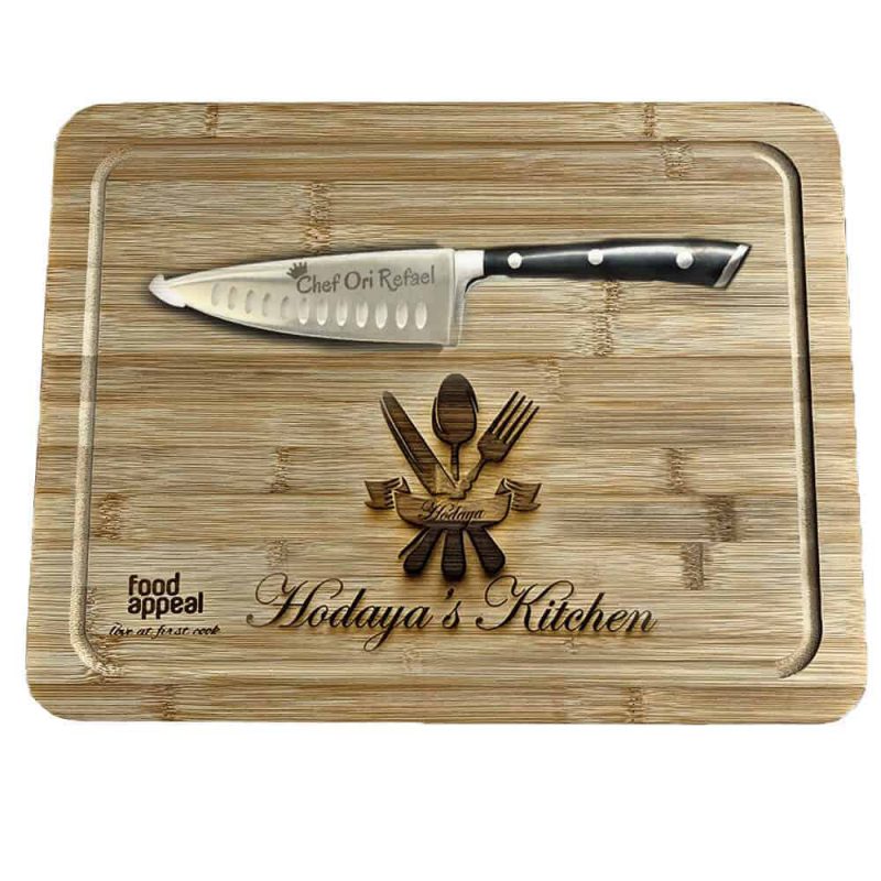 אנו מציעים לכם סט מתנה לשף שיכלול קרש חיתוך וסכין שף מקצועית עם חריטה אישית לבחירתכם.